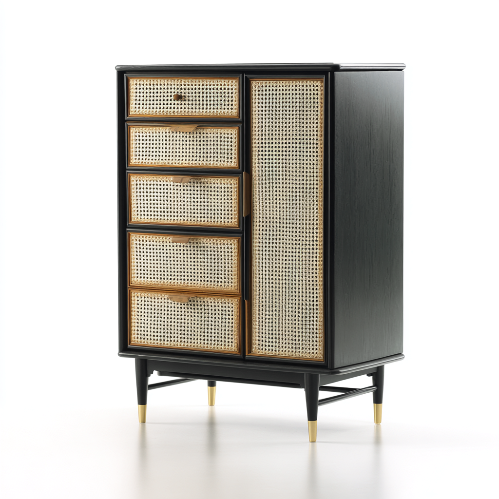 Scarpiera in legno e rattan con anta e cassetti 68x38x108 cm - nero-naturale - design moderno